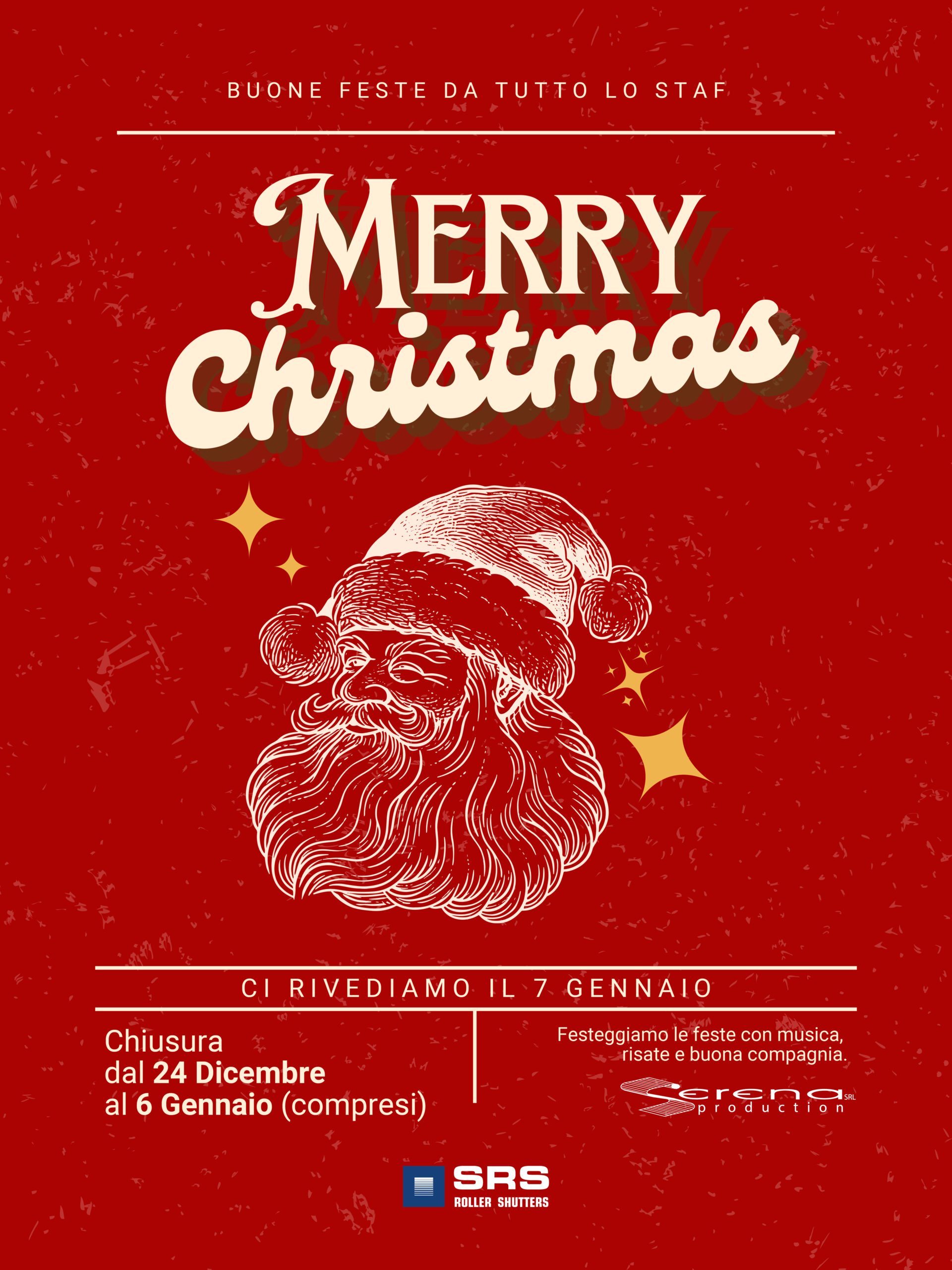 Serena Production S.r.l. informa i gentili clienti e partner che, in occasione delle festività natalizie, resteremo chiusi dal 24 dicembre al 6 gennaio compresi. Le attività riprenderanno regolarmente il giorno 7 gennaio.